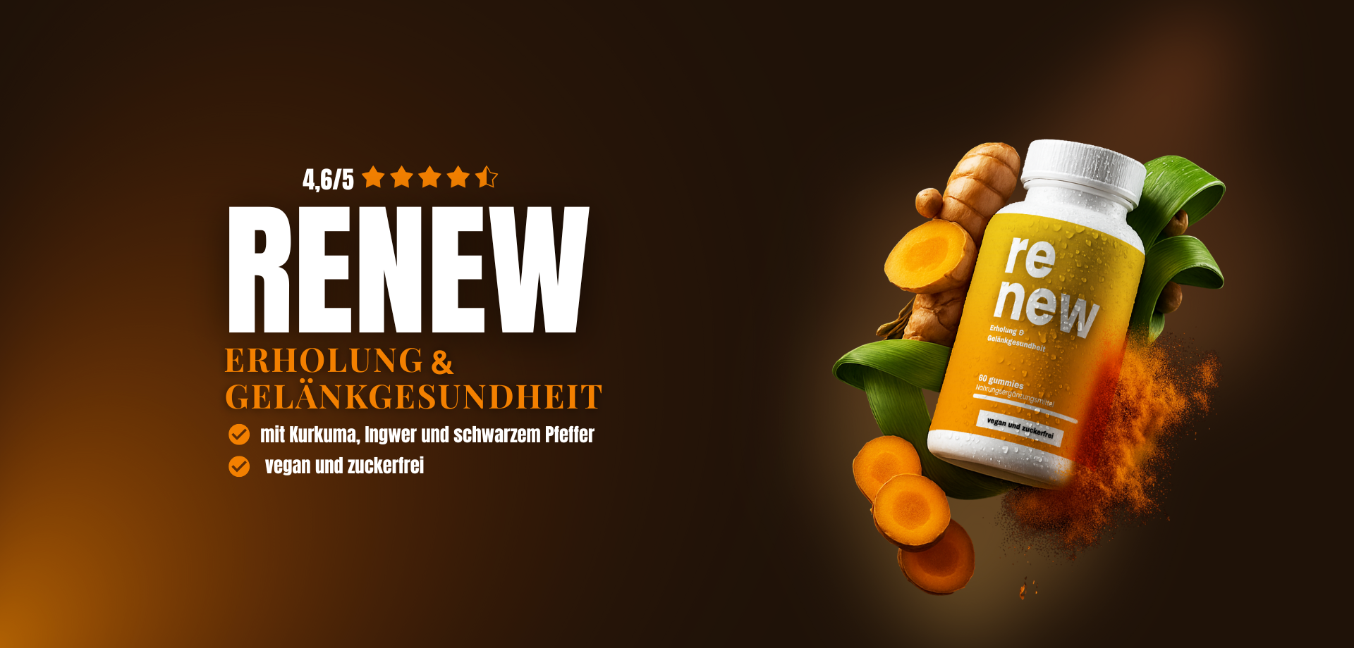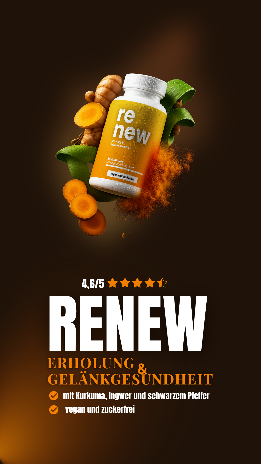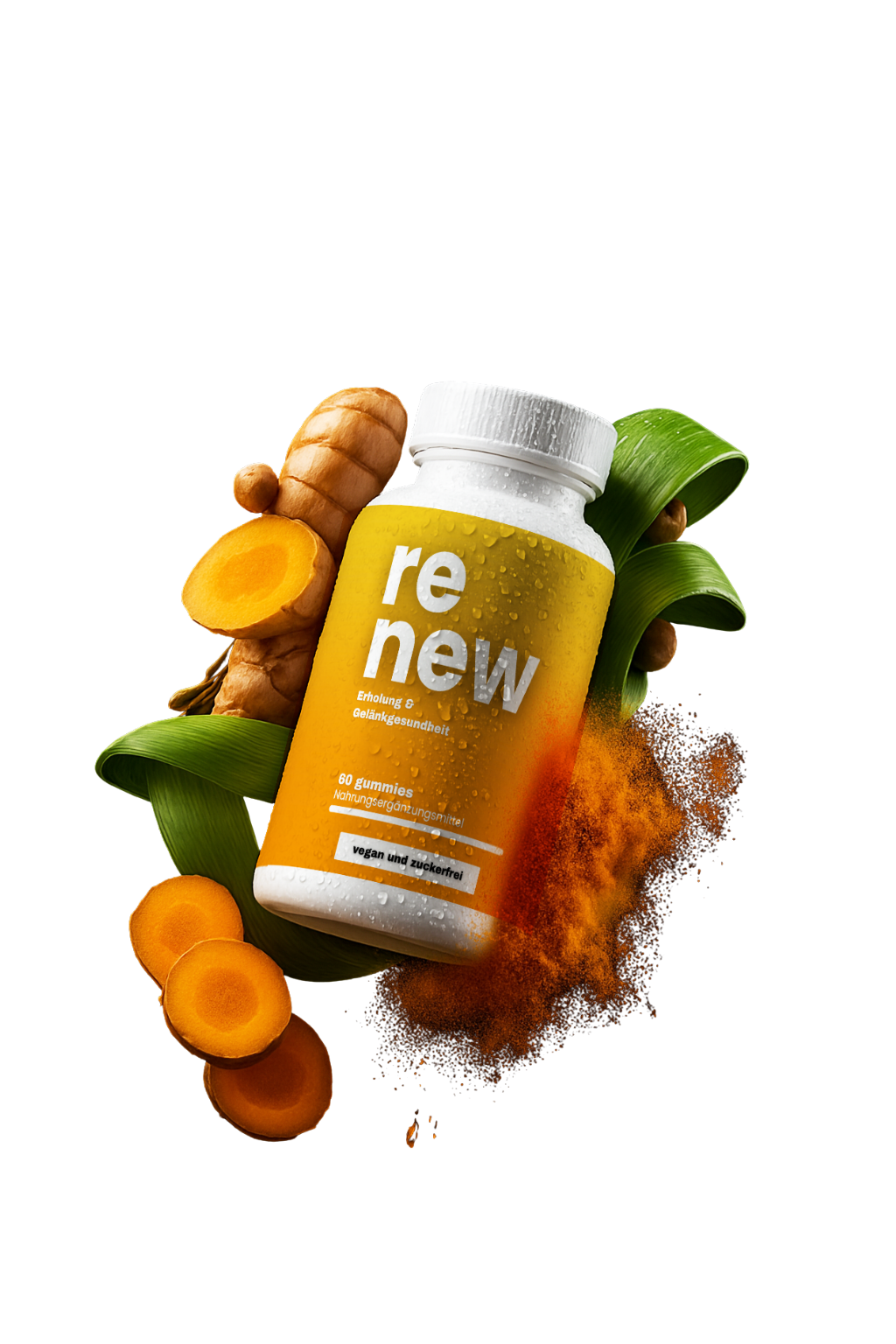 RENEW kombiniert Kurkuma, Ingwer und schwarzen Pfeffer, um dein Immunsystem zu unterstützen, deine Regeneration zu fördern und zu mehr Balance, Schlafqualität und Vitalität beizutragen
